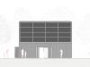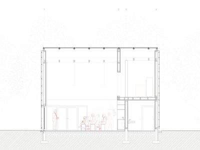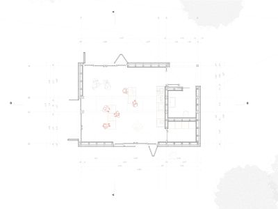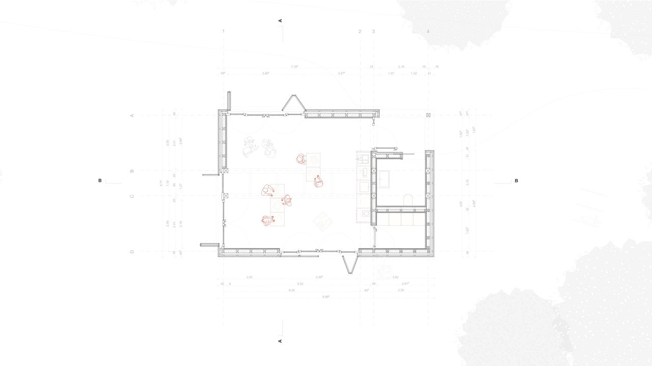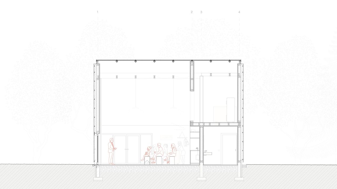 Durch den Eingangsbereich gelangt man in den multifunktionalen Raum. Dieser öffnet sich zur "Stelle" und schafft mit seinen drei großen Öffnungen Blickbezüge zur "Stelle", zum Weg und zur anderen Uferseite. Der Raum kann von der Gemeinde für verschiedene Anlässe und Ereignisse genutzt werden. So kann vorübergehend ein Café betrieben, Yoga Kurse veranstalten werden, der Musikverein kann hier regelmäßig proben und es können verschiedene Workshops und Vorträge stattfinden. Mit einfachen Mitteln kann der Raum an das Ereignis angepasst werden, um so den Treffpunkt für weitere Gruppen aufzuwerten. Dies ist vor allem durch die selbst entworfenen Möbel möglich. Die Möbel sind kleine Module, die frei im Raum verschoben werden können. Jedes dieser Module hat eine eigene Funktion und ist gleichzeitig eine Erweiterung der Theke. Die Module sind so gestaltet, dass sie in einem Workshop selber verschoben und somit individuell genutzt werden können.