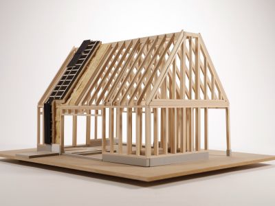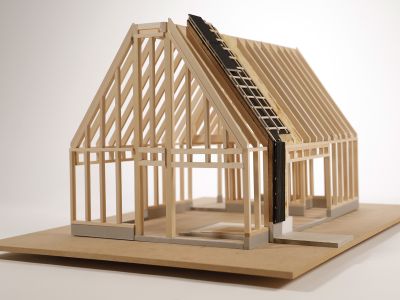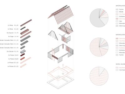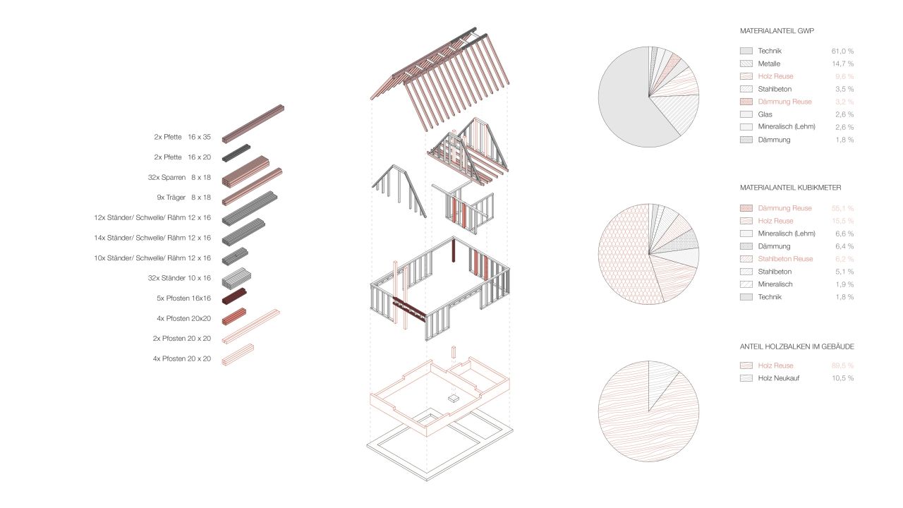 Schon während des Entwurfs wurde auf das Wiederverwenden von Materialien geachtet. So wurde ein vorheriges Projekt der Hochschule als Materiallager verwendet, bei dem man möglichst viele Holzelemente weiterverwenden sollte. Durch das frühe Planen mit den vorhandenen Materialien besteht unser Holztragwerk aus etwa 90 % an wiederverwendeten Elementen. Des Weiteren wurde darauf geachtet, dass wenig Beton verwendet wird. Somit haben wir einen Schichtenaufbau anstatt einer Betonbodenplatte.