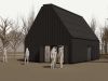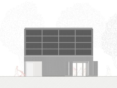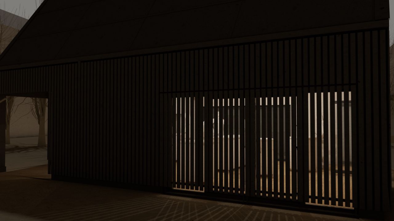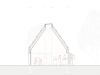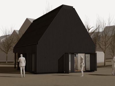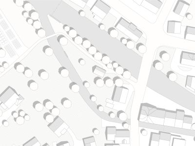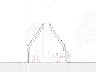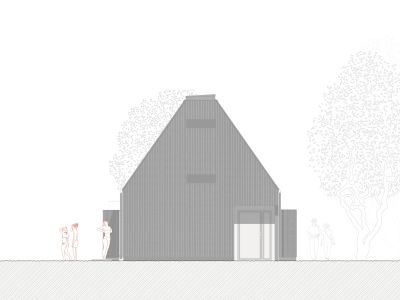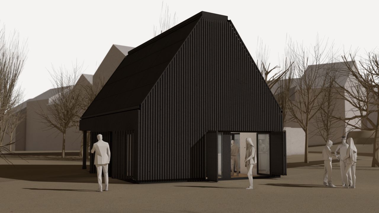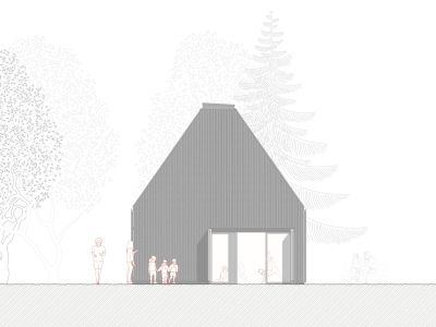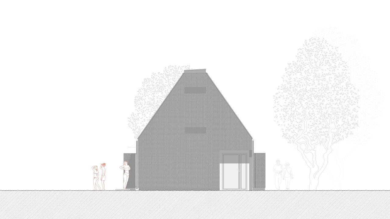 Vor Ort fällt die Eingangssituation von der Mühle aus kommend auf, da man hier durch eine Art Tor aus Bäumen zur "Stelle" gelangt. Dieses hebt sich durch das viele Grün und eine abgeschirmte Atmosphäre von der Umgebung ab. Das Ankommen wollten wir mit unserem Gebäude verstärken. Somit ist es östlich auf der "Stelle" platziert und nimmt eine bedienende Rolle für die "Stelle" ein. Die Gebäudeform mit dem steilen Satteldach nimmt Bezug auf die umliegenden Gebäude, setzt sich dennoch ab, wodurch die „Stelle“ als besonderer Ort für die Gemeinde hervorgehoben wird.
