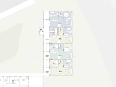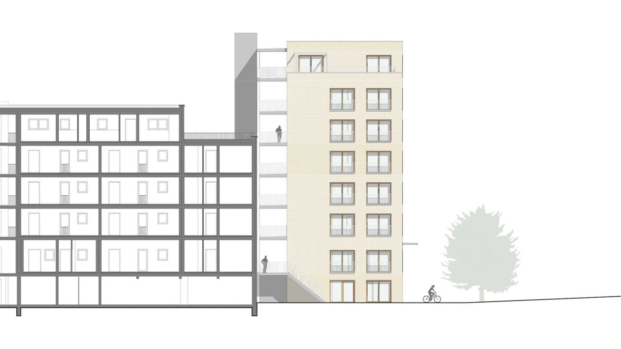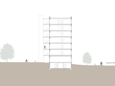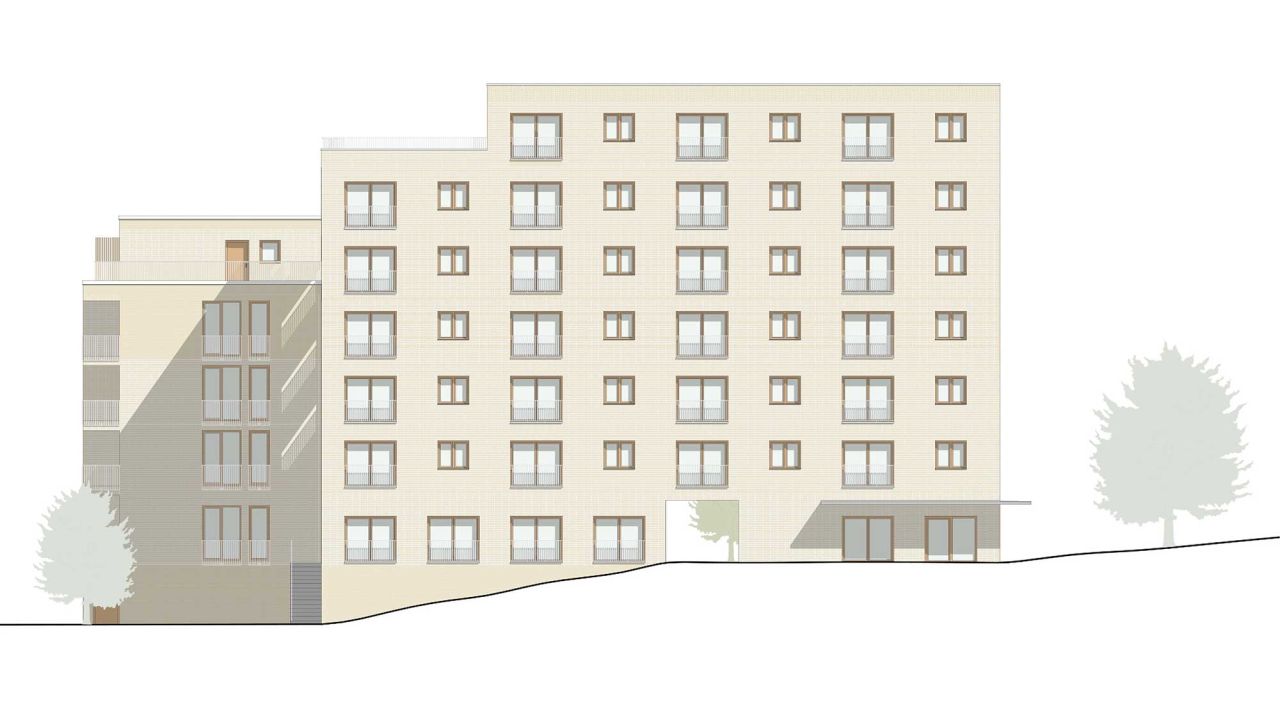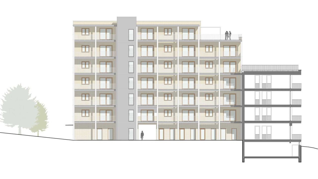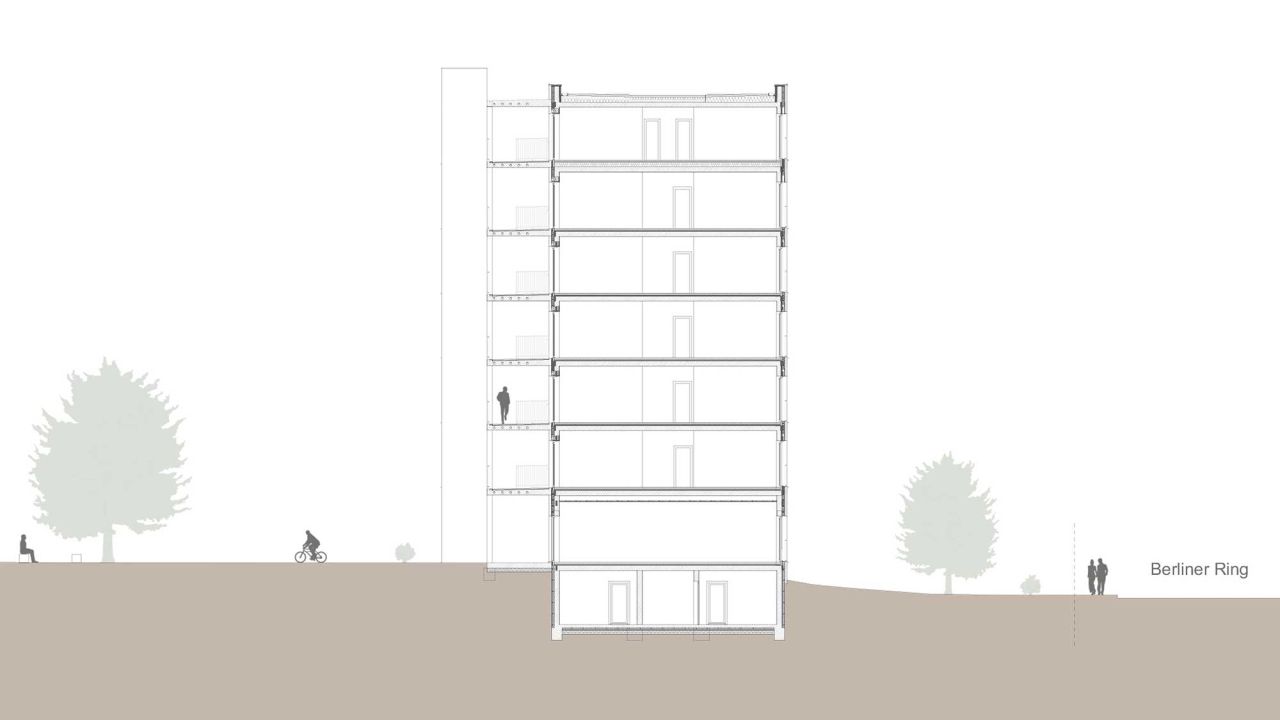 AufgabeDer aus den 70er Jahren stammende Tübinger Stadtteil Waldhäuser-Ost soll nachverdichtet werden. Dafür wurde ein Parkplatz neben der Geschwister-Scholl-Schule für ein Quartier mit etwa 80 bis 100 Wohneinheiten bereitgestellt. Im zweiten Semester war es die Aufgabe eines dieser Gebäude im Städtebau Ensemble in Partnerarbeit zu planen.Dieses Projekt wurde im Rahmen der BEST OF Ausstellung an der HFT-Stuttgart im Oktober 2024 ausgestellt.Unser Gebäude ist das Östlichste und mit 6 Vollgeschossen das Höchste im Ensemble. Die Position direkt am Berliner Ring sorgt dafür, dass das Ankommen eine große Rolle spielt und zudem das Quartier nach außen repräsentiert wird. Aus diesem Grund sollten das Erdgeschoss so gestaltet sein, dass es mehrere Zugangsmöglichkeiten zum Innenhof gibt.Das Erdgeschoss ist der Gemeinschaft und Öffentlichkeit zugeteilt. Somit findet sich im Norden, angrenzend zum Eingangsplatz ein Café. Dieses ist nach Nord-Osten orientiert, um vor allem Kunden von aus dem ganzen Stadtteil anzusprechen. Südlich des Durchgangs, in der Mitte des Gebäudes, befinden sich ein Gemeinschaftsraum. Dieser kann von den Bewohnern des Quartiers angemietet werden, um für zum Beispiel Geburtstage mehr Platz zu haben. Der Gemeinschaftlich genutzte Waschsalon ist mit großen Fenstern versehen. Der lichtdurchflutete Raum soll eine Möglichkeit für spontane Begegnungen mit Nachbarn bieten.Die Wohnungen folgen in den Obergeschossen dem Prinzip der schaltbaren Räume. Somit ist es möglich die Wohnungsgrößen dem Bedarf an Wohnungen anzupassen. So sind 1 bis 5 Zimmerwohnungen möglich, die den Bewohnern unterschiedlich großen Wohnraum bieten. Diese Variabilität wurde mit 8 Abschnitten ermöglicht, die abwechselnd ein Wohnbereich und zwei Individualräume mit Badkern sind. Der Wohnbereich ist von Osten nach Westen durchgesteckt. Im Westen wird der Wohnbereich mit dem Laubengang erweitert. Hier hat jede Wohneinheit einen eigenen Freibereich. Die offene Gestaltung fördert den Kontakt zwischen den Bewohnern und sorgt für ein Wohnen in der Gemeinschaft. Das innere Raster wird durch die unterschiedlich großen Fenster sowie die Stützen des Laubengangs nach Außen gespiegelt. Im 6. Obergeschoss befindet sich neben zwei Wohnungen auch eine Gemeinschaftsterrasse sowie ein angrenzender Gemeinschaftsraum. Dieser Rücksprung folgt einerseits der Topografie, sorgt aber auch für einen sanfteren Übergang zum Nachbargebäude, das 2 Vollgeschosse weniger hat.